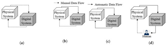 Kritzinger et al. [5] define a DT as a digital system with an automatic data flow both from and to a PT. When this flow is automatic from the PT to the digital system only and manual in the other direction, they call the digital system a digital shadow. Below, their figures are reproduced in Figure 1a–c as this work is based on their definitions. In fact, a DT is seen here as the convergence of an IS and a simulation, or in other words, the concept of DT increases the dynamism of an IS by not only recording the past and present states of the PT, but also forecasting its future by simulation.