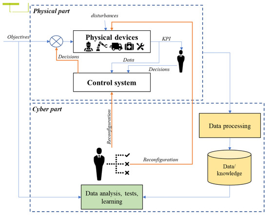 In a domain close to the concept of DT, Cyber Physical Production Systems are “systems of systems of autonomous and cooperative elements connected with each other in situation dependent ways, on and across all levels of production, from processes through machines up to production and logistics networks, enhancing decision making processes in real time, response to unforeseen conditions and evolution along time” [15]. From all existing architectures in this context, the one by Cardin et al. [16] illustrates the positioning between the physical part and the cyber (i.e., digital) part, with a clear integration of the human in the decision loop (Figure 2).