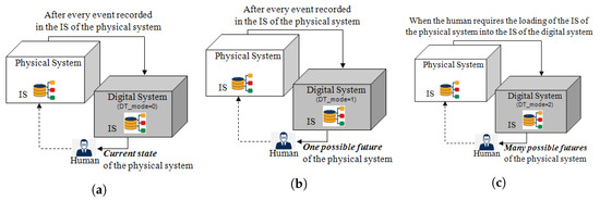 The proposed refinement on Kritzinger et al. [5]’s DT taxonomy is now explained. This version relies on the difference between sim_* and ds_* transitions. As previously said, sim_* transitions model interactions with other agents in the digital system in order to perform simulations, while ds_* transitions re-synchronise these agents on their counterpart in the PT. All ds_* transitions have at least the condition “DT_mode <= 1”, and sim_* have “DT_mode >= 1”. Consequently, the value of DT_mode selects one of the three modes of the digital system detailed in Figure 3: