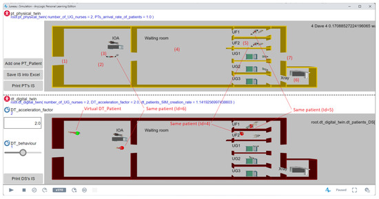 The lower half of Figure 4 shows the digital system. It is running in Mode “Synchronised DT” (cf. DT_mode ) and twice as fast as the PT (cf. DT_acceleration_factor ). The lower 3D window shows three patient agents with a red disk at their feet because each of them corresponds to a real patient. A fourth patient agent has a green disk showing that it is virtual in the sense that it does not correspond to a real patient in the PT. Of course, all agents exist only in the digital system, but the word “virtual” means here that the green agents are randomly created by the digital system to simulate future arrivals of patients, and these ones are destroyed with each synchronisation of the digital system on the PT.