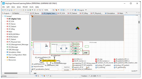 In AnyLogic, red disk icons represent agents. Double-clicking such red icons in the left-hand side tab in Figure 5 opens the editor of this type of agent in the other tab. The right-hand side tab in Figure 5 shows that Agent DT_Digital_Twin has a state chart with a single (yellow) state waitForMessages to add (Transitions dt_addPatient_DS and dt_addPatient_MON (Section 4 will explain that every instance of DT_Patient corresponds to either (i) a real patient in the PT shown with a green disk in Figure 4 and added by dt_addPatient_DS whenever a real patient enters the PT, or (ii) a simulated patient shown with a red disk and randomly added by dt_addPatient_MON when the digital system simulates one possible future of the PT. This ability of simulating the future also explains that the digital system has a copy of the information system of the PT (cf. IS in Figure 5)) and removes (Transition dt_removePatient_DS) DT_Patients from the digital system, and forwards messages from the PT to the agents (Transition dt_forwardMessage). The right-hand side tab in Figure 5 also shows that DT_Digital_Twin contains six populations of agents (dt_IOAs[…], dt_xray[…], …, dt_patients_SIM[…]). (Similarly, Agent Main contains an instance of DT_Digital_Twin and an instance of the PT_Physical_Twin because the PT is simulated.)