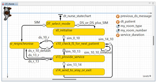 Figure 6 gives details on the behaviour of one of the types of agents “living” in DT_Digital_Twin, namely DT_Nurse. This figure illustrates again that all the proposed agents are modelled as states and transitions. A name starting with sim_ is given to the transitions and a name starting with sXX_ to the states (where “s” means “state” and “XX” is the order of activation of this state, e.g., s13_provide_service runs after s12 in an agent not shown in this article). (Figure 6 is complete and hence also shows ds_* transitions, and sr_resynchronise and DT_select_mode states which will be described in the next subsections. Only the four states s0_initialise, s10_check_IS_for_next_patient, s13_provide_service and s14_send_to_xray_or_exit were added in this first step of development.)