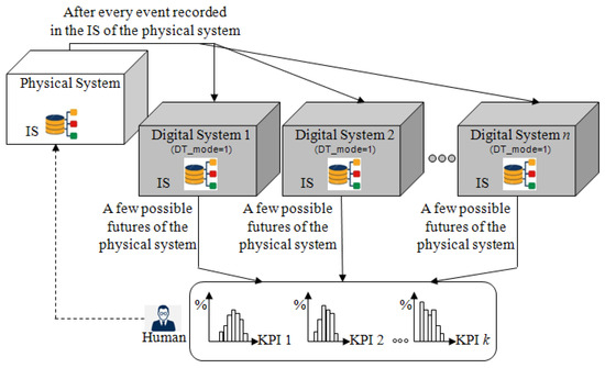 Monte Carlo simulations: Replication of the variety of possible futures in a Synchronised DT can be obtained by () using n digital systems in parallel. Each of these simulates one replication, that is, one possible future, as shown in Figure 8, and () restarts each of the n digital systems when it has simulated a given duration (e.g, the next 24 h for an ED) in order to make each digital system perform more than just one replication.