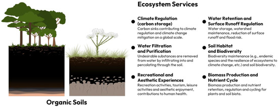 Organic soils provide many ecosystem services (Figure 1). In addition to functioning as carbon sinks, they play an important role in maintaining the hydrological cycle since the regions where these soils occur regulate the water flow of watersheds. In addition, the organic soils have great relevance in relation to biodiversity, since they are associated with various phytophysiognomies where the processes of ecological interaction of species of fauna and flora are intrinsically associated with the flow of water table oscillation in organic soils, and this ultimately influences the availability of biodiversity resources and the maintenance of interactions between species [7,8].