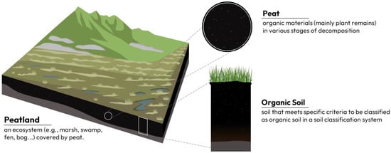 Organic soils are often associated with peatland ecosystems, which is why some related concepts and definitions may overlap. Although there are different definitions in the literature according to the earth sciences, conventionally there is their basic relation: peat is the material (organic materials, predominantly of plant origin) from which a peatland ecosystem is formed (e.g., marsh, swamp, fen, bog) [9,10,11,12]. The soils found in these areas are generally classified as organic soils.