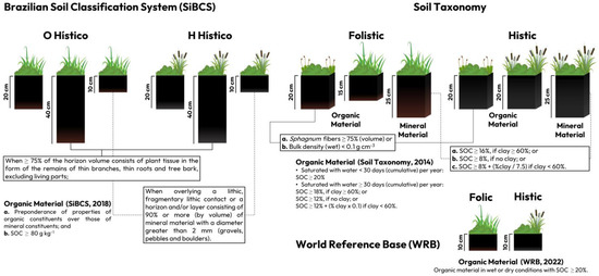 The definitions and classifications of organic soils vary between classification systems. This item compares the classification of these soils in the Brazilian Soil Classification System (SiBCS) [3], World Reference Base for Soil Resources (WRB) [1], and Keys to Soil Taxonomy (ST) [2]. SiBCS has as its priority the classification of soils in the Brazilian territory and has some criteria, attributes and concepts that originated from correlated definitions in WRB or ST. The WRB and ST systems are recommended by the International Union of Soil Sciences (IUSS) as international for soil correlation activities, reports for technical documents, soil mapping at various scales, and scientific publications [17].