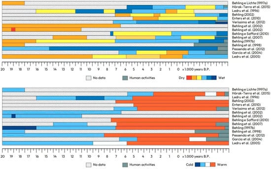 Summary of environmental changes in terms of humidity, temperature, and the impact of human activities in southeastern Brazil [24,31,32,33,34,36,39,40,44,57,58,59,60,61]. Source: Pieruschka and Ledru [56].
