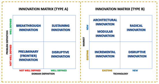 The second type of innovation matrix (“TYPE B” in Figure 2) classifies the innovation types according to the following criteria: markets (existing or new) and technology (existing or new) [36,37,38].