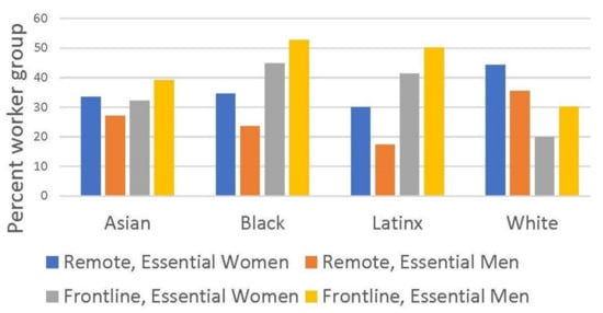 Figure 1). In New York City, the data indicate that higher percentages of minority workers were putting themselves at risk to do their jobs on site during the pandemic than White workers. Minorities are more likely to be frontline workers than Whites, by a large margin. Where more than 50% of Black men are frontline workers, only 30% of White men have frontline jobs. There are equally large gaps in the percentages of frontline workers by race/ethnicity group for women; about 45% of Black women are frontline workers compared with only 20% of White women.