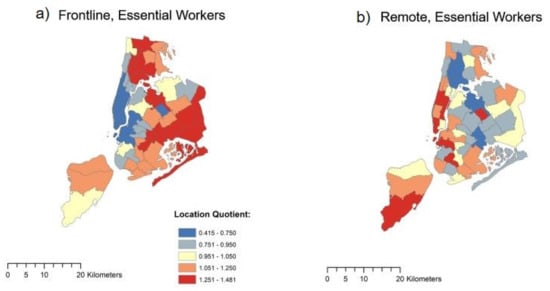 Figure 2a). The location quotients show that frontline workers are concentrated in distant areas of Queens, Bronx, and Brooklyn (