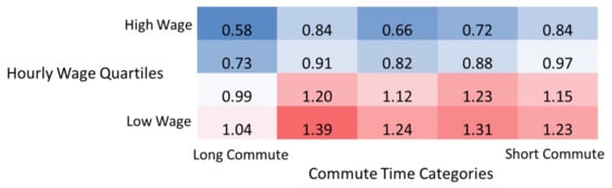 Figure 5). In the typologies, the upper right cell (quadrat) identifies commuting advantage—high wages and short commutes. Frontline workers in this category have commuting times of 15 min or less and hourly wages in the highest quartile. The lower left-hand cell identifies commuting disadvantage. Wages for workers in this cell are low, in the bottom quartile of the wage distribution, and their commuting times are long, over an hour. Each cell of the typology is shaded according to its relative concentration (quotient) of workers: red colors indicate that workers are overrepresented in that category compared to the overall workforce, and blue tones indicate that workers are underrepresented.