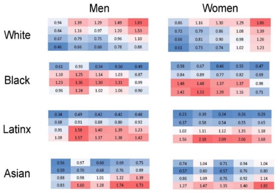 Figure 5). In the quadrat with the highest average wages and commuting times of no more than 15 min, the quotients of 0.48 and 0.29 for Latinx men and women, and 0.49 and 0.47 for Black men and women, compare unfavorably with values of 0.75 and 1.04 for Asian men and women in the same situation. There is also evidence of gender disparity among Asian workers, as women’s and men’s disparate quotient values show overrepresentation of Asian women in frontline jobs with low wages and commuting times that exceed an hour (quotient = 1.27), and underrepresentation of Asian male workers (quotient = 0.83).