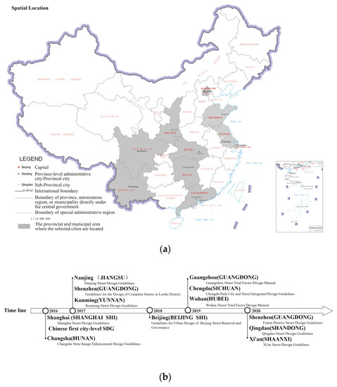 Spatial locations and timeline of SDGs in China ((a): spatial location; (b): timeline). Source: by author on the basis of data from [19,20,21,22,23,24].
