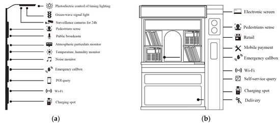 The Guidelines for the Urban Design of Beijing Street Renewal and Governance promote the development of technology applications from the perspective of efficiency and sustainability (Table 2) [19]. The guidelines propose that technologies are used for smart transportation, and they advocate that signal light poles should hold some electronic equipment (Figure 2a) and be integrated to save space. The guidelines present a vision of multifunctional combinations of urban furniture, allowing that furniture to provide a more comprehensive range of convenience services, such as newsstands (Figure 2b). In addition, from the perspective of environmental monitoring, sensors on the streetlamp shades could monitor the microclimate in real time by collecting various types of data, such as on air pollutants, light intensity, noise, heat islands, etc. The sensors could also monitor the flow of people and calculate signaling data to assess street vitality, ultimately giving feedback to managers via wireless networks. The guidelines also suggest that street-level data could be shared and first-hand information could be used for terminal analyses.