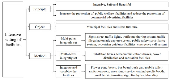 The Shanghai Street Design Guidelines state that new materials and technologies applied in the street space should achieve sustainable development [20]. The sustainable construction of streets according to the guidelines can be summarized as relating to five aspects: transportation, life, vitality and enrichment, safety, and the environment (Table 3). The guidelines propose that the coordination of transportation facilities is more efficient in facilitating residents’ mobility. As relates to the aspect of convenient living, the installation of electronic-screen-realized multisource information dissemination and real-time release of various city information is recommended. The guidelines also state that the consolidation of municipal facilities into a facility belt should be encouraged (Figure 3). As an improvement for life enrichment, some communications media were incorporated into public art installations. The application of audio, video, and heat-sensing technologies could improve self-protection. The use of interactive media, data terminals in urban furniture, and multiple sensors achieve monitoring and management of the living environment. The guidelines also propose that data should be collected and feedback provided so as to dynamically adjust urban activities via various smart technologies. The establishment of a comprehensive smart city platform is also proposed to analyze different activities.