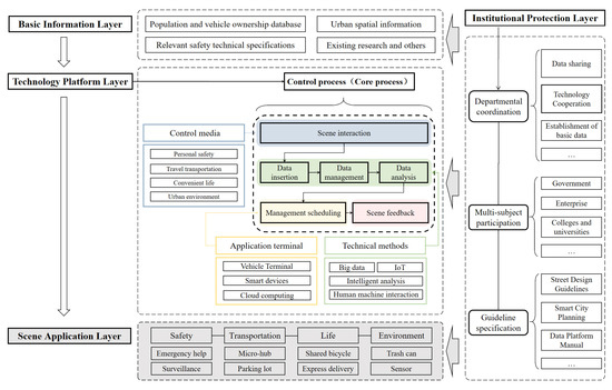 The basic information layer collects data maps from multiple departments. The project’s planning–construction–management process (whole-life cycle) must gradually promote linkages among departments, which can improve the efficiency of interdepartmental work in practice. A population database and vehicle ownership data are collected and updated based on the urban spatial information census data in this layer. Based on the relevant exceptional safety technical specifications and existing research, this layer enriches data lists and supports subsequent technical operations. The improvement of data collection provides strong support for city managers to make decisions. In practice, the collection of data can rely on various types of sensors equipped in the streets, and new methods can be applied to achieve it. As presented for previous SDGs, urban data can be captured from basic surveys, transportation statistics, and records on public services and the environment. Among these, radar, photography, and portrait technologies can contribute to measuring various types of basic information.