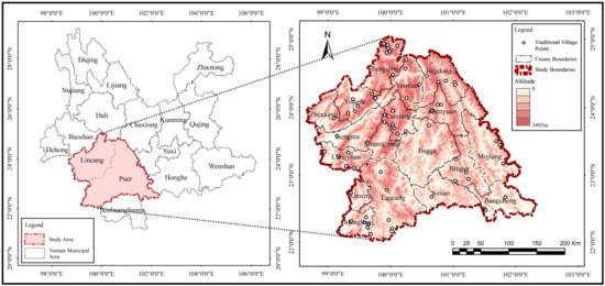 The Wa Mountain Area (22–24° N, 99–100° W) (Figure 1) includes the Lincang and Pu’er regions, according to the Brief History of the Wa People (1986) [21,22,23]. The first to fifth batches of 75 traditional villages in total within 18 counties in the region published by the Chinese Traditional Villages Network (http://www.chuantongcunluo.com/) (accessed on 1 February 2023) [24] were selected as the target population. According to the results of the seventh census, the population of the Awa Mountain area is about 4,663,000, in which the population of ethnic minorities accounts for 49.9%, including Wa, Lahu, Yi, Dai, Brown, and other ethnic minorities living in the area. The terrain is complex, with very few flat terraces. It has a typical subtropical monsoon climate, rich biodiversity dominated by tropical plants, rich mineral resources, a maximum altitude of 3495 m, an average annual precipitation of 1108.7 mm, and an average annual temperature of 18.45 °C.