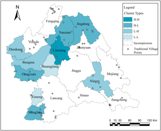 It is possible to estimate whether there is local spatial clustering of traditional villages with high and low values of distribution, classified as high–high (H–H), low–low (L–L), high–low (H–L), and low–high (L–H) clustering [33].