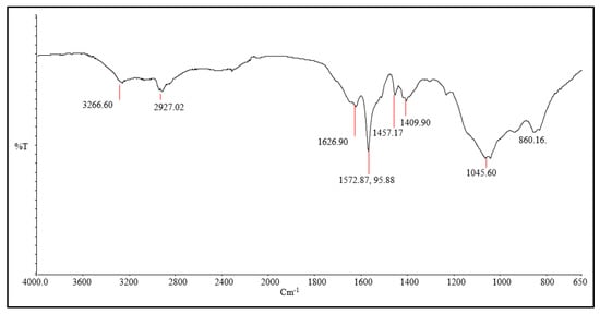 An FTIR test was also carried out to find the functional group in the digested sludge sample, as shown in Figure 1. The sample was place mounted on the sample disc, the spectroscopic imaging test was carried out, and transmission spectra of the essential functional groups present in the sludge were obtained, as shown Figure 1. The FTIR interpretations of peaks showed that the first peak is in the range of 3600–3300, indicating the presence of the hydroxyl group; the next peak is from 1600–1500, indicating the presence of the carboxyl group (COOH); the next peak ranges from 1100–1000, indicating the presence of the (C==O) group; and the next peak indicates the presence of the phosphate group (PO4), confirming the presence of amino acids, polysaccharides, humic acid and other extracellular polymeric substances (EPS) from microbial activities in the anaerobic digester.