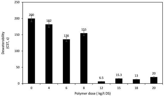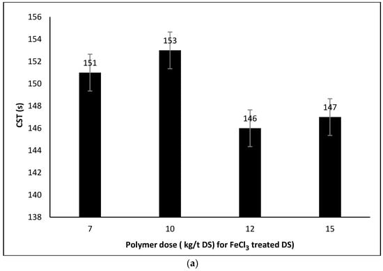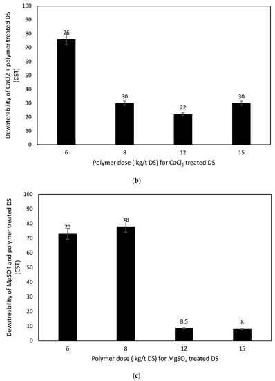 The effect of the addition of EMA 8845 MBL polymer along with metal cations on dual conditioning was also investigated in this study. The effect of a polymer dose in the range of 4 kg/t DS—20 kg/t DS was first investigated, as shown in Figure 5, and it was observed that a polymer dose of 12–15 kg/t DS was the optimum. Furthermore, the effects of dual conditioning of digested sludge for three different metal cations and EMA MBL polymer was studied. Figure 6 shows that the dewaterability of the anaerobically digested sludge was increased due to the addition of the polymer compared to the performance of the metals alone. In particular, the dewaterability for CaCl2 and MgSO4 was significantly improved compared to that achieved in the case of FeCl3, as shown in Figure 6b,c. This is due to the synergistic chemical complexation between calcium and magnesium salts with the emulsion polymer [,].