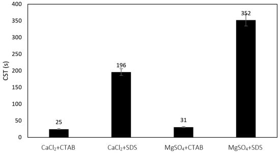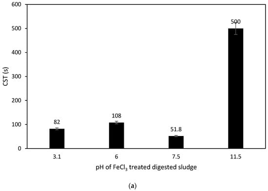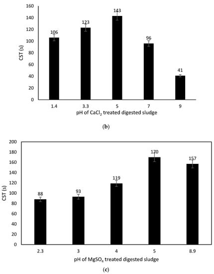 The effect of pH on the dewaterability of metal cation conditioned digested sludge was investigated for the pH range of 1–12 for FeCl3, CaCl2 and MgSO4 conditioned digested sludge as shown in Figure 10a–c. FeCl3 was observed to provide optimum dewaterability of 82 s at a pH of 3.1 as shown in Figure 10a. Similarly, MgSO4 conditioned digested sludge showed better dewaterability of 88 s at a pH of 2.3 as shown in Figure 10c, whereas the dewaterability of CaCl2 conditioned digested sludge was better at an alkaline pH of 9, as shown in Figure 10b.