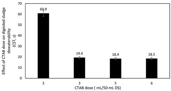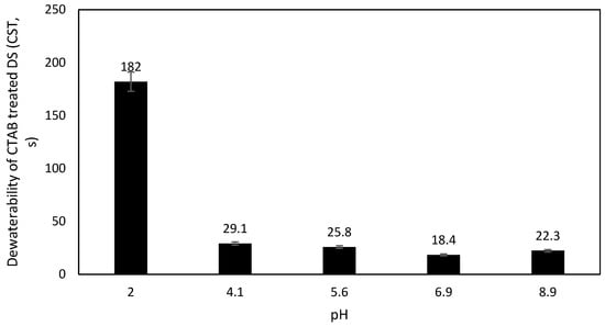 The effects of the addition of cationic surfactant CTAB and anionic surfactant SDS for the enhancement of flocculation and dewaterability of digested sludge were also investigated in this study. Dual conditioning of sludge metal cations and the surfactants was also investigated. Figure 7 shows that the dewaterability of digested sludge was enhanced by the dual conditioning of the metal cations and the CTAB, as the cationic charge of the sludge surface could be increased and better flocculation achieved []. Unlike the case with CTAB, the addition of SDS resulted in no improvement of the dewaterability of the digested sludge. Hence, further study on the surfactants was conducted on CTAB alone. Figure 8 shows that the optimum dose of CTAB for efficient dewaterability of digested sludge was 60 mL/LDS; any further increase in CTAB dose did not result in any improvement of the dewaterability of the digested sludge. The effect of pH on the performance of CTAB was also investigated in this research in the pH range of 2–9, as shown in Figure 9. The dewaterability was observed to be better at a neutral and alkaline pH than in the acidic range [,]. This clearly shows the surface charge which favors dewatering.