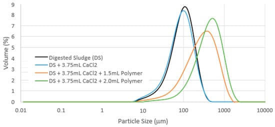 Effect of CaCl2 and polymer conditioning on particle size distribution of digested sludge (DS).