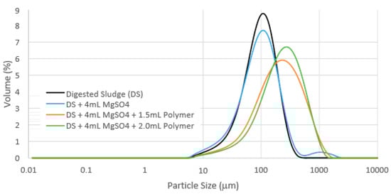 Effect of polymer dose and MgSO4 on particle size distribution of digested sludge (DS).