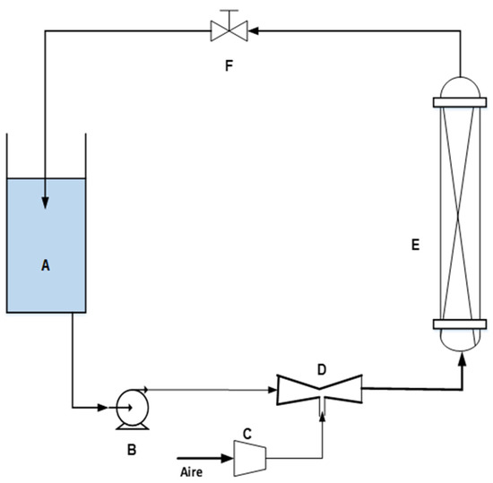 The experiments in the fixed bed column were carried out in a compact unit containing a reservoir for storing the feed solution of acrylic material of 4 L capacity. A water pump with a power of 25 W and flow rate of 36 L/h, connected by a synthetic pipe with an internal diameter of 5 mm, drives the water to the packed bed column. The column was made of acrylic material with an internal diameter of 7 cm and a height of 34 cm; inside the column in the form of a cylinder there was a 50 μm mesh of polypropylene material to maintain the integrity of the bed during the entire experimental phase. A SOBO AP 200 air pump of 2 W power and adjustable flow, with a maximum flow rate of 3 L/min, and a pressure of 0.02 MPa was used for air intake through a venturi tube of 6.35 mm of diameter. The schematic diagram of the column adsorption system is shown in Figure 1.