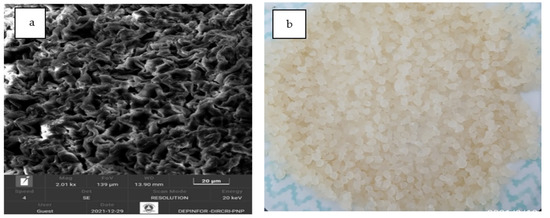SEM microphotography of calcium alginate (a); calcium alginate is 2–3 mm in diameter (b).