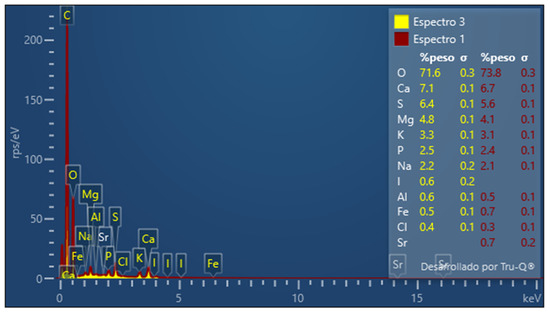 The chemical characteristics of biosorbents are identified by the energy-dispersive X-ray spectroscopy (EDX) analysis. The chemical composition of the adsorbent by EDX analysis is shown in Figure 3. The peaks of the elements in weight percentage O (71.6%), Ca (7.1%), S (6.4%), Mg (4.8%), K (3.3%), P (2.5%), I (12.21%), Na (2.2%), I (0.6%), Al (0.6%), Fe (0.5%), and Cl (0.4%) are shown. The main elements present in the material are O, Ca, S, Mg, and K.
