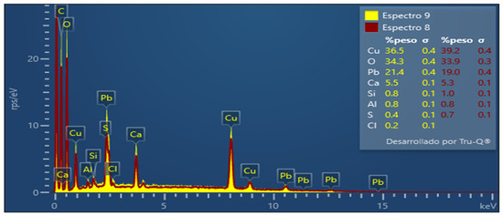 To confirm the presence of ions Pb2+, Cu+2, and Sb3+ in the alginate beads, the EDX spectra were investigated. The EDX spectrum for the intact alginate does not present the characteristic peak of lead and copper (Figure 3), while the EDX alginate spectrum loaded with the aqueous solution clearly shows the lead and copper peak (Figure 4). The peaks in the percentages of adsorbed metal ions of lead (21.4%) and copper (36.5%) are shown in Figure 4. Therefore, SEM/EDX analysis confirms that the biosorbents have the ability to remove metal ions from an aqueous solution.