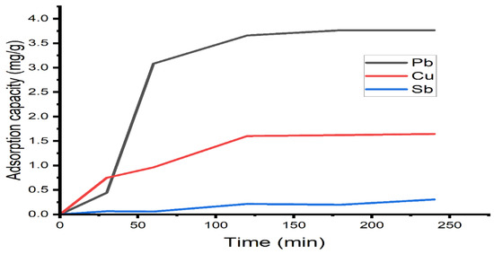 The effect of the contact time on the adsorption capacity of calcium alginate for lead, copper, and antimony ions is shown in Figure 5. It is observed that it increases rapidly in the first 50 min of treatment, then increases slowly, reaching a maximum adsorption capacity within the first 120 min for lead at 3.76 mg/g and copper at 1.64 mg/g. Antimony increases in slow steps, reaching equilibrium at 0.01 mg/g. After this time, no significant change in treatment time was observed. This observation may be due to the fact that, at initial step, the numbers of available sites for adsorption of Pb2+, Cu2+ is greater than when close to equilibrium [37].