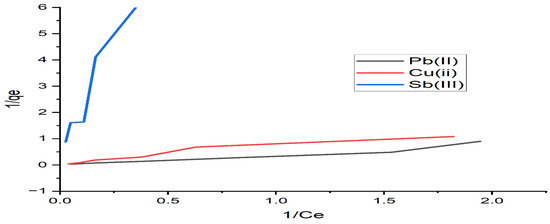 Different adsorption equilibrium isotherms and kinetics models are used to simulate the correlation between the amount of Pb(II), Cu(II), and Sb(III) adsorbed at equilibrium () and concentration of the liquid phase at equilibrium. Equation (3) demonstrates the Langmuir model, as follows: