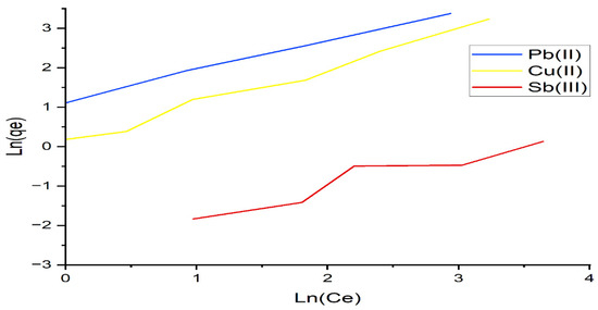 The adsorption isotherm expresses the specific relation between the concentration of adsorbate and its degree of accumulation onto the adsorbent surface at a constant temperature. The Langmuir and Freundlich models were used to obtain the adsorption isotherms. The Langmuir model is based on the assumption that all adsorption sites are equally active. The plots of the Langmuir and Freundlich isotherms are shown in Figure 7 and Figure 8, respectively. The model equations, the values of the constants calculated from these equations, and the square of the correlation coefficients of the models are presented in Table 4. According to Table 4, the experimental data were best fitted by the Freundlich isotherm, with the highest R2 value of 0.976 for lead and copper. From Table 4, the n values of the Freundlich model are 1, indicating a favorable adsorption onto the investigated algae. Similar results of maximum lead adsorption capacity (63.69 mg/g) were also reported by [38]. For the Toth isotherms, the coefficient of determination is higher than 0.99 for lead and copper ions, and it is 0.90 for antimony, as shown in Table 4. We conclude that the equation with three parameters shows very good agreement with the experimental data.