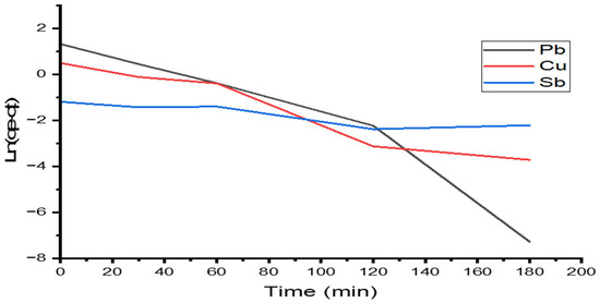 Figure 6 shows the adsorption efficiency of lead, copper, and antimony ions on calcium alginate as a function of adsorption time. Lead exhibits the highest adsorption efficiency, followed by copper ions. The adsorption efficiency was 90% for lead ions. Copper has an adsorption efficiency of around 80%. During the 30 min of adsorption, the adsorption rate is very fast and decreases until the adsorption equilibrium is reached. The slope to equilibrium is steep for lead and copper. Antimony ions reach less than 10% adsorption in 240 min. This difference in percentage removal of the metal ions can be attributed to their charge and ionic radius. Therefore, Pb(II) and Cu(II) ions with a charge (+2) adsorbed better on the sorbent surface than antimony, which reached 10% removal.