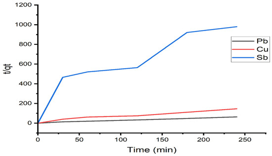 Pseudo-second-order kinetic plots for Pb(II), Cu(II), and Sb(III).