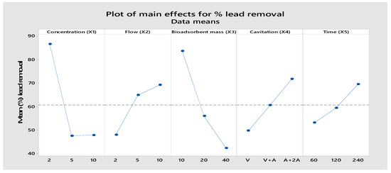 Main effect plot for the means of percentage for lead removal.