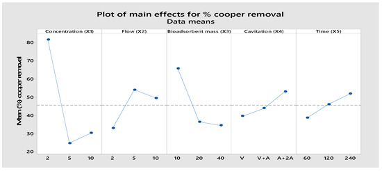 Main effect plot for the means of percentage for copper removal.