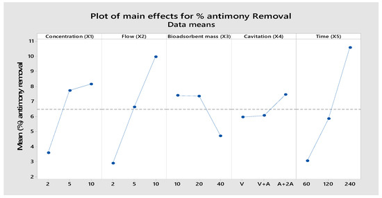 Main effect plot for the means of percentage for antimony removal.