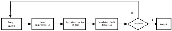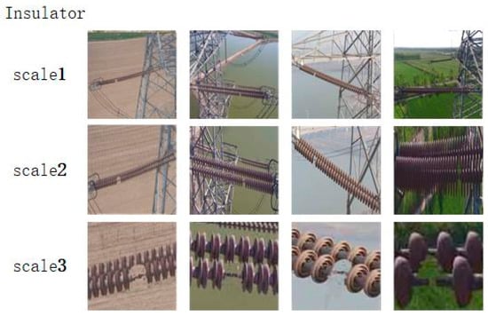 Over the past decade, much research has been based on the traditional machine vision algorithm for fault detection. Some researchers consider the color characteristics of insulators. Zhang [1] converts the image from RGB color space to HIS color space and uses morphological algorithms in HIS space to locate the insulator target and realize fault detection. Li [2] applies the OTSU threshold segmentation algorithm to extract the insulator in the RGB space target. Han [3] identifies the insulator object according to the image color transformation and OTSU algorithm and uses the spatial sequence relationship between insulators to construct a feature for fault diagnosis. Some scholars make fault diagnoses according to insulator morphology characteristics. For Wu [4], fault diagnoses are made according to the membership function of the difference degree of measurement, the standard difference matrix of insulator failure, and, on the basis of an improved SIFT algorithm, he takes advantage of the differences between the insulators to extract the feature points, which established fixed detection templates. The failure of insulators is effectively detected by using contrast and template difference. Zhang [5] divides insulators into blocks and judges insulator failure according to the similarity of block structure. Zhao [6] using an OAD–BSPK algorithm, divides insulators according to angle of insulator shape and the size of accurate positioning. Other researchers have used feature point matching algorithms to extract insulator targets. Reddy MJB [7] extracted insulator characteristics using discrete S transform and applied it to SVM classifier recognition. Jiang [8] used OTSU and SIFT methods to generate insulator feature vectors, separate insulators one by one, and calculate Euclidean spacing between adjacent insulators so as to determine the fault free insulator sheet. Zhang [9] combines corner matching and spectrum clustering to diagnose insulator faults. Shang [10] uses AdaBoost classifier to identify insulators and calculate the Euclidean distance between the insulators, thus realizing fault detection. On this basis, the insulator fault diagnosis method based on the combination of image processing and machine learning classifier is proposed. First, the characteristics of the insulator are designed, and the insulator is classified by the machine learning classifier so as to achieve the purpose of positioning and fault recognition of the insulator. However, due to the influence of illumination, angle, complexity, and other factors, the characterization ability of the feature information is not strong, and the recognition effect of the model is poor. At the same time, because a characteristic of manual design is the identification of specific targets, its generalization performance is very low, and it is difficult to accurately detect insulator failure in complex environments.