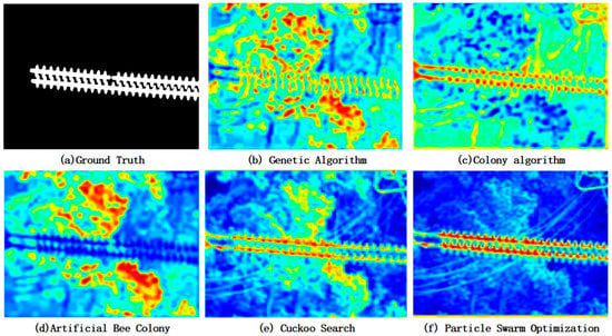 When considering the balance of information loss and clipping elements among multiple convolution levels, an adaptive optimization algorithm is needed to screen out the optimal solution for calculation. Genetic algorithm (GA), ant Colony algorithm (ACO), Particle Swarm Optimization (PSO), Artificial Bee Colony (ABC), and Cuckoo Search (CS) are all optimization algorithms based on population. A probabilistic search algorithm for optimization steps is implemented by means of iteration. The experimental thermal map of the above five optimization algorithms combined with the algorithm in this paper is shown in Figure 5 below.