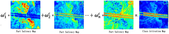 The model consists of five pooling layers, and five types of prediction results are analyzed. On this basis, the weight of five levels corresponding to its adaptive ability is obtained by using the inter-level attention recurrence function and the information loss function. The final input image classification results are performed by multilevel VGG-PSO tags, then the category of each layer is inserted into the full connection layer, and the final classification results are obtained by softmax. A specific treatment of the weighted heat map is shown in Figure 6.