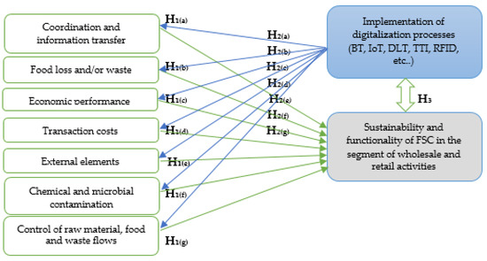 H2—digitalization of business processes has a statistically significant effect on critical indicators in FSC in the segment of wholesale and retail activities. Testing this hypothesis determines if and in what way the implementation of BT, IoT, DLT, etc., minimizes the negative effect that critical indicators have on the sustainability and functioning of the FSC. As in the previous step, the second research hypothesis must be supported by seven supporting hypotheses H2(a)–H2(g), which test the connection of the digitalization process with each of the analyzed critical indicators. The supporting hypotheses are: H2(a)—the digitalization process has a statistically significant effect on the coordination and transfer of information among FSC participants in the segment of wholesale and retail activities; H2(b)—food loss and/ or waste has a statistically significant effect on the sustainability and functioning of the FSC in the segment of wholesale and retail activities. H2(c)—the digitalization process has a statistically significant effect on economic performance in the segment of wholesale and retail activities; H2(d)—the digitalization process has a statistically significant effect on transaction costs appearing in the FSC in the segment of wholesale and retail activities; H2(e)—the digitalization process has a statistically significant effect on external elements in the segment of wholesale and retail activities; H2(f)—the digitalization process has a statistically significant effect on chemical and microbial contamination in the FSC in the segment of wholesale and retail activities; H2(g)—the digitalization process has a statistically significant effect on the control of raw material, food, and waste flows in the FSC in the segment of wholesale and retail activities.