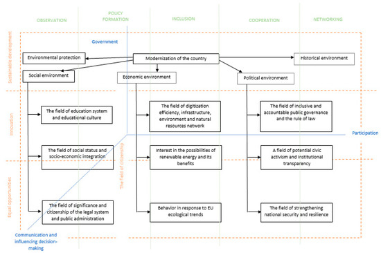 The modern world faces a double challenge: environmental degradation and social inequality [1]. To solve the problem of environmental degradation, in 2015, the United Nations (UN) approved 17 sustainable development goals, divided into 169 tasks and grouped into three areas: social, economic and environmental. When defining sustainable development, and a sustainable environment, scientists emphasize the active participation of the community [2]. It also emphasizes, and Masser distinguishes, the principles of sustainable development: partnership and accountability; active participation and transparency; a systemic approach; connection with the future; equality and justice; ecological constraints; the relationship between the local and global scale; and local importance [3]. He singles out active participation as a principle.
