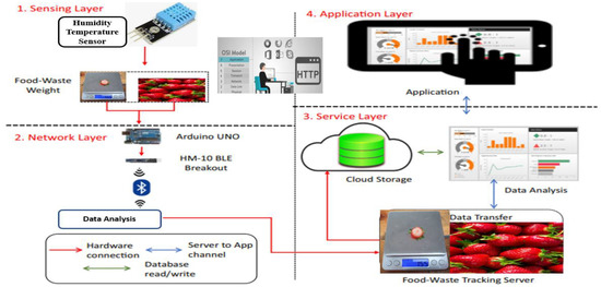 According to Marjani et al. [23] and Al Nuaimiet al. [24], IoT offers a platform for sensors and devices to communicate seamlessly within a smart environment and enables information sharing across platforms in a convenient manner. Smart cities have seen a recent adoption of IoT. This is due to interest in intelligent systems, such as smart offices, smart retail, smart agriculture, smart water, smart transportation, smart healthcare, and smart energy. By using different types of sensors based on their application and communication technology, IoT is used in smart supply chains to reduce food wastage. Figure 1, inspired by Jagtap et al. [25], illustrates IoT as a platform for FWR in a smart supply chain. As is illustrated, the four layers of sensing, application, network, and service form an IoT system, which is indicated for FWR applications.