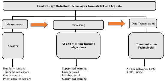 In the work by Anagnostopoulos et al. [43], a visual tree for waste management is developed. It can be further developed to reduce food waste. Figure 3 illustrates how to classify the technologies that reduce food wastage. Anagnostopoulos et al. [43] review the literature related IoT-based technologies for reducing food waste in different layers of sensing and measurement, processing, and data transmission. As illustrated in Figure 3, there are various technologies that are used for the purpose of minimizing food waste. In the following sections, we examine these technologies and discuss the challenges. The term ‘smart’ refers to the process of checking the quality of food based on sensing and data analysis approaches, which will be discussed in more detail later. Here, we review the sensor technologies and introduce various types of sensors and their applications to better understand the measurement and data collection process in advanced IoT-based systems that aim to minimize food waste. Sehrawat et al. [44] review various types of IoT sensors. Table 2 provides a definition of these sensors and their applications in the food supply chain.