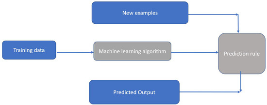 ML methodologies consist of a learning process with the objective of learning or experiencing trained data with the aim of performing a task. The data in ML might be nominal, binary, or numeric. The performance of the ML models is measured by a metric using various statistical and mathematical models. The trained model can be used to predict or cluster new examples. Figure 4 illustrates the ML approach.