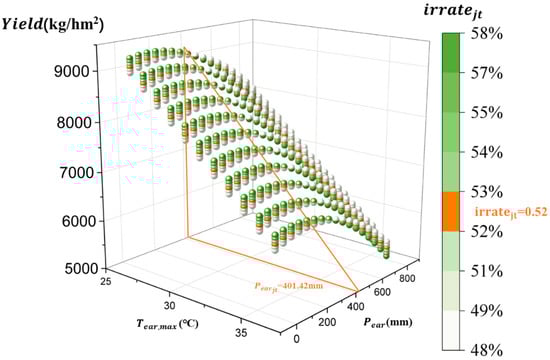 Response of crop yield Y to the maximum daily temperature and total precipitation during the ear stage (the orange sphere represents = 52%).