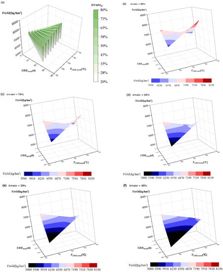 However, the maize yield responded differently to extreme meteorological conditions under different levels of effective irrigation rates (Figure 3b–f). At high effective irrigation rates and long dry spells, as increased, the maize yield easily increased. Figure 3b shows that at = 80%, with the increase in CDD, the increase in the effective irrigation rate dampened and sometimes reversed the decrease in the summer maize yield. This means that irrigation reversed the negative impacts of drought on maize. By contrast, at low effective irrigation rates and long dry spells, with the increase in , the maize yield did not improve as much as it did with the increase in the high irrigation rate. Furthermore, the effective irrigation rate increased the maize yield with an increase in the temperature during longer but not shorter dry spells (Figure 3a).